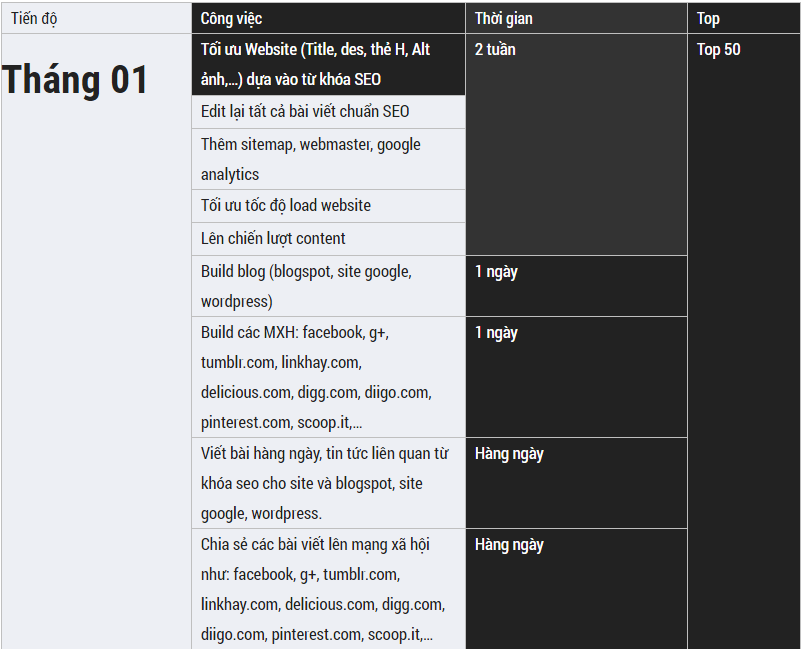 Dưới đây là những kế hoạch cần làm trong 6 tháng từ các bước tối ưu onpage, offpage, xây dựng site vệ tinh đến các kênh mạng xã hội